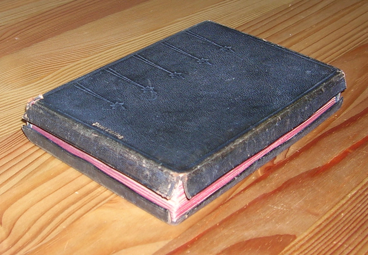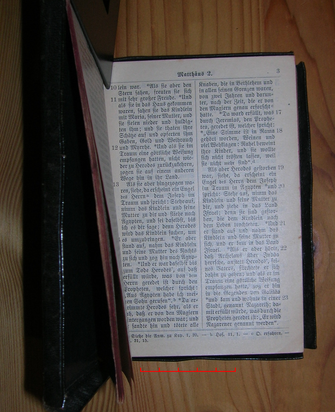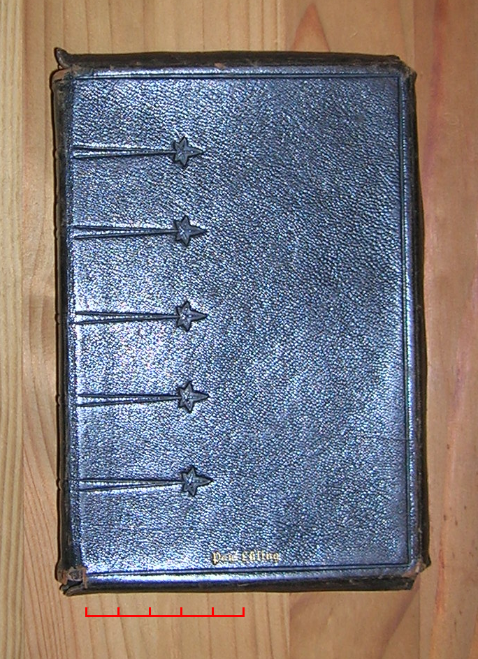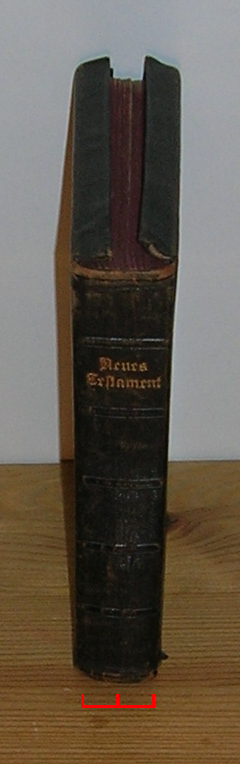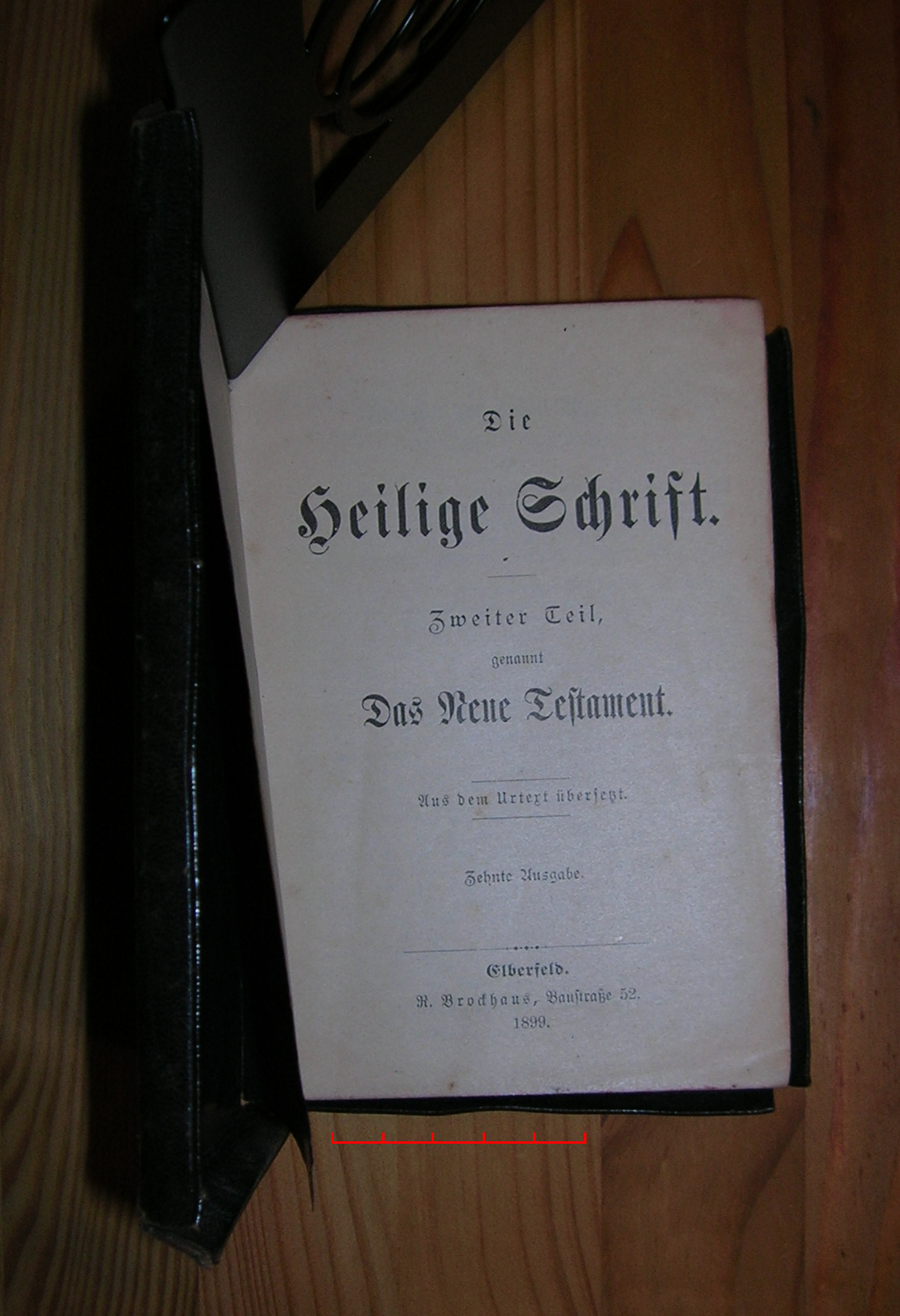 Schutzklappen, violetter Schnitt, goldgeprägter Name, Fraktursatz. Druck von A. Fastenrath, Elberfeld, Mäuerchenstr. 38. Übersetzung: Elberfelder 1899 NT. Enthält vorn „Vorrede zur ersten Ausgabe des Neuen Testamentes (1855)“, „Vorrede zur zweiten Ausgabe (1865)“, „Vorrede zur siebenten und achten Ausgabe (1891)“, „Verzeichnis der Bücher des Neuen Testamentes“ und „Erklärung der Abkürzungen in den Anmerkungen“; hinten „Verzeichnis der wichtigsten vom Texte abweichenden Lesarten, sowohl des Textus receptus, als auch mehrerer wertvoller Handschriften“.