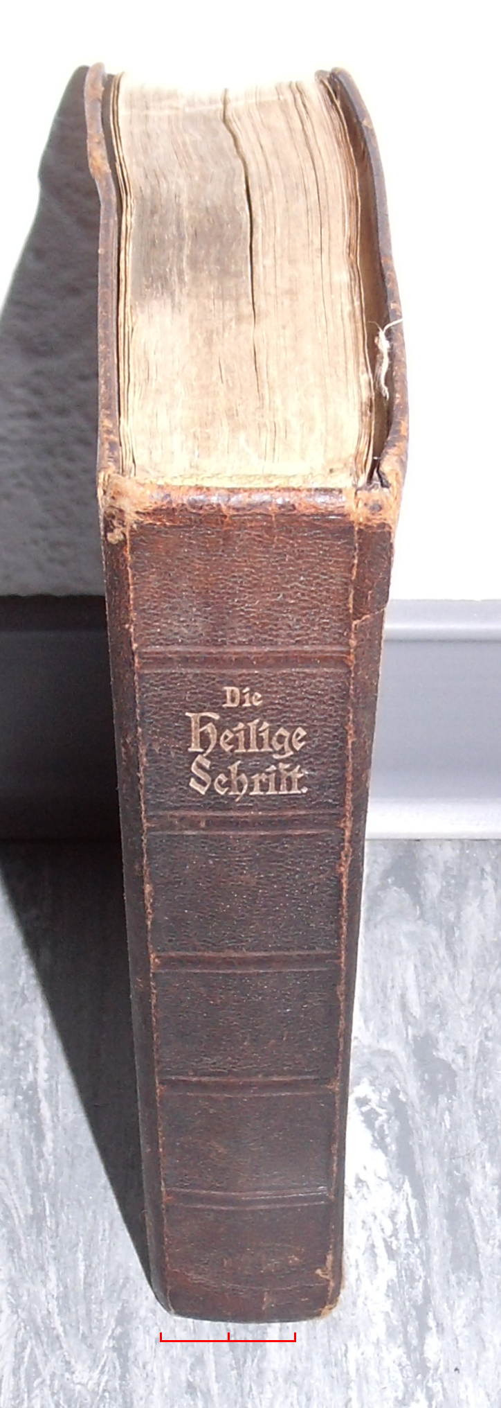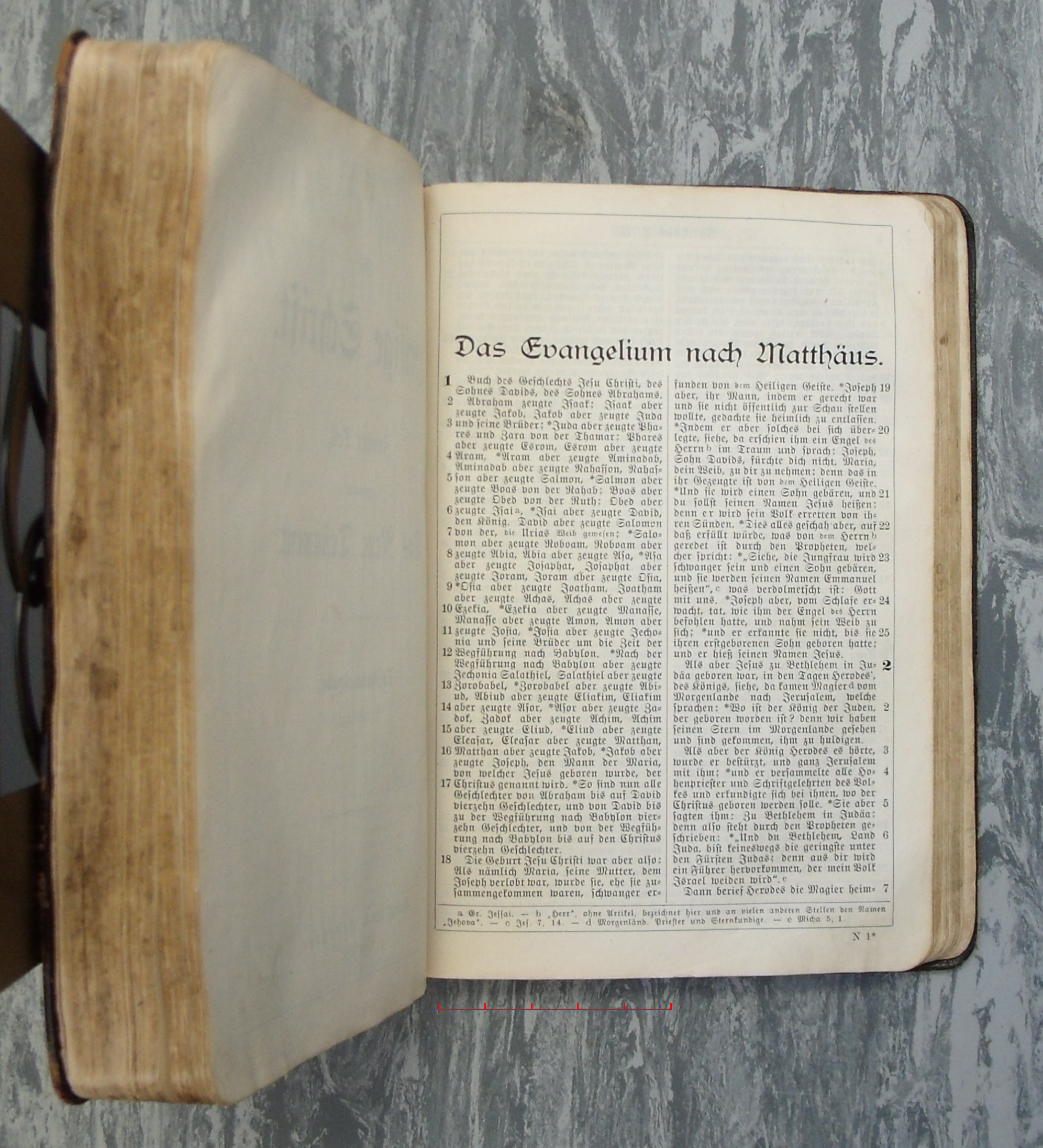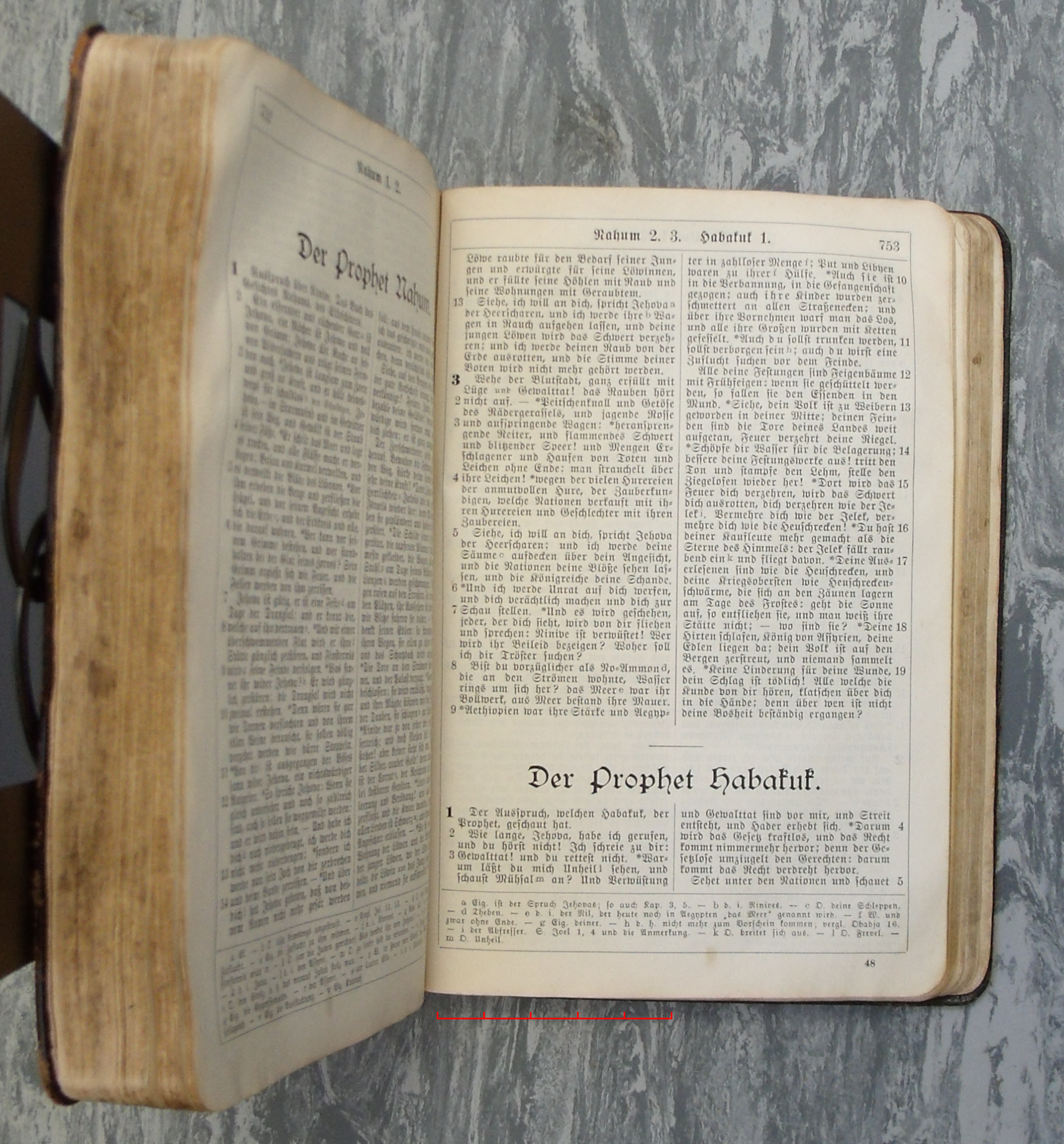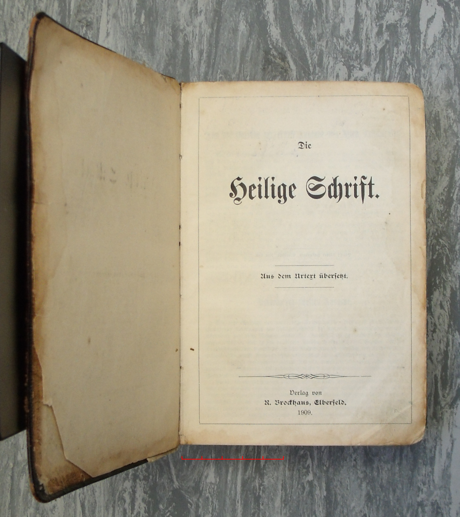 Fraktursatz. Druck: Albert Fastenrath, Elberfeld, Aue 1-5. Übersetzung: Elberfelder 1909. Enthält vor AT „Aus der Vorrede zur ersten Ausgabe des Alten Testamentes (1871)“, „Vorrede zur zweiten Ausgabe (1891)“, „Aus den Vorreden zur ersten und zweiten Ausgabe des Neuen Testamentes (1855/1865)“, „Vorrede zur siebenten und achten Ausgabe (1891)“, „Verzeichnis der Bücher des Alten Testamentes“, „Verzeichnis der Bücher des Neuen Testamentes“ und „Erklärung der Abkürzungen in den Anmerkungen“; dahinter „Vergleichende Zeittafel der Könige und Propheten von Juda und Israel“ und „Vergleichende Zeittafel von Adam bis Abraham“. Enthält nach NT „Verzeichnis der wichtigeren vom Texte abweichenden Lesarten“ und 8 farbige Tafeln der Kartogr. Anst. Hofer & Co. Zürich: „Die Sinai-Halbinsel mit dem Zuge der Israeliten durch die Wüste nach Kanaan“, „Palästina - Einzug des Volkes Israel u. Verteilung des Landes unter die zwölf Stämme“, „Die vier Weltreiche“, „Palästina zur Zeit Christi und der Apostel“, „Palästina aus der Vogelschau“, „Jerusalem und Umgebung - Zur Zeit Christi und der Apostel“, „Jerusalem - Zur Zeit Christi & der Apostel“ sowie „Die Reisen des Apostels Paulus“.