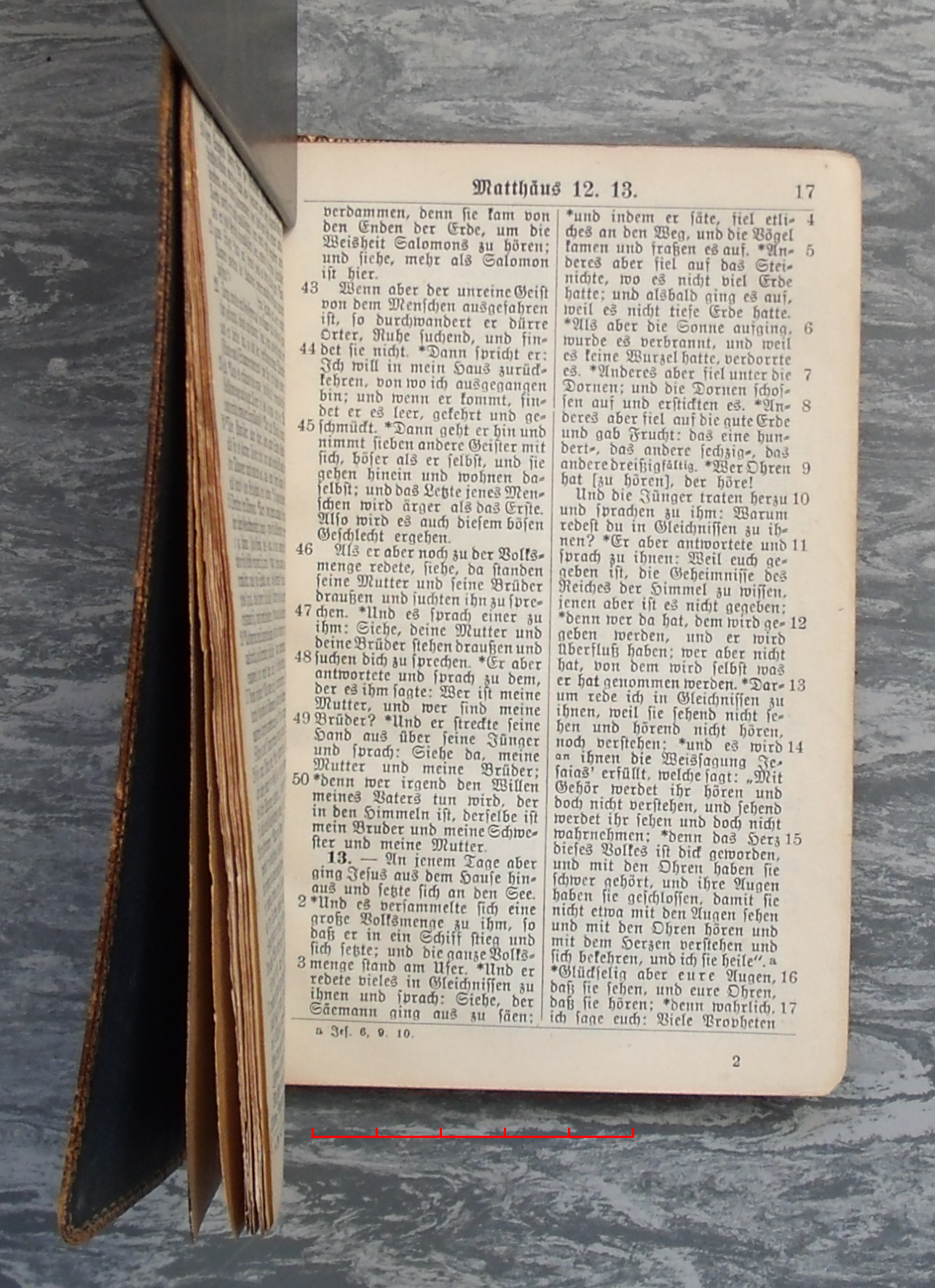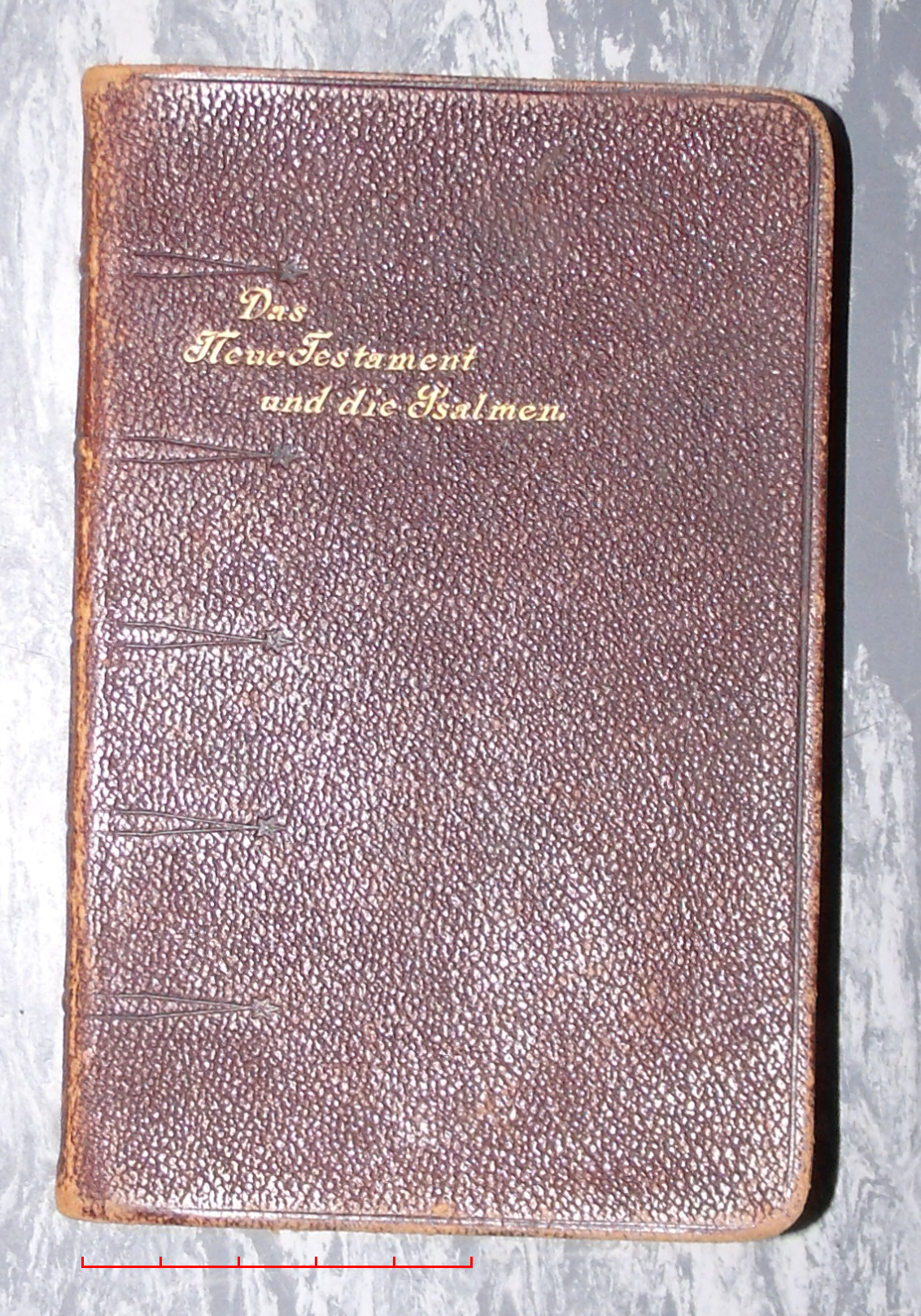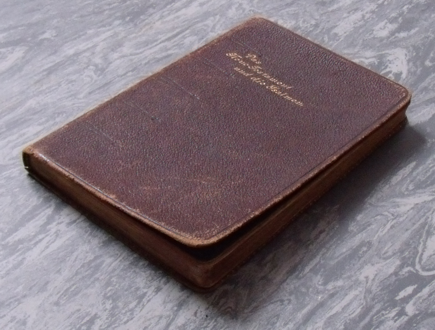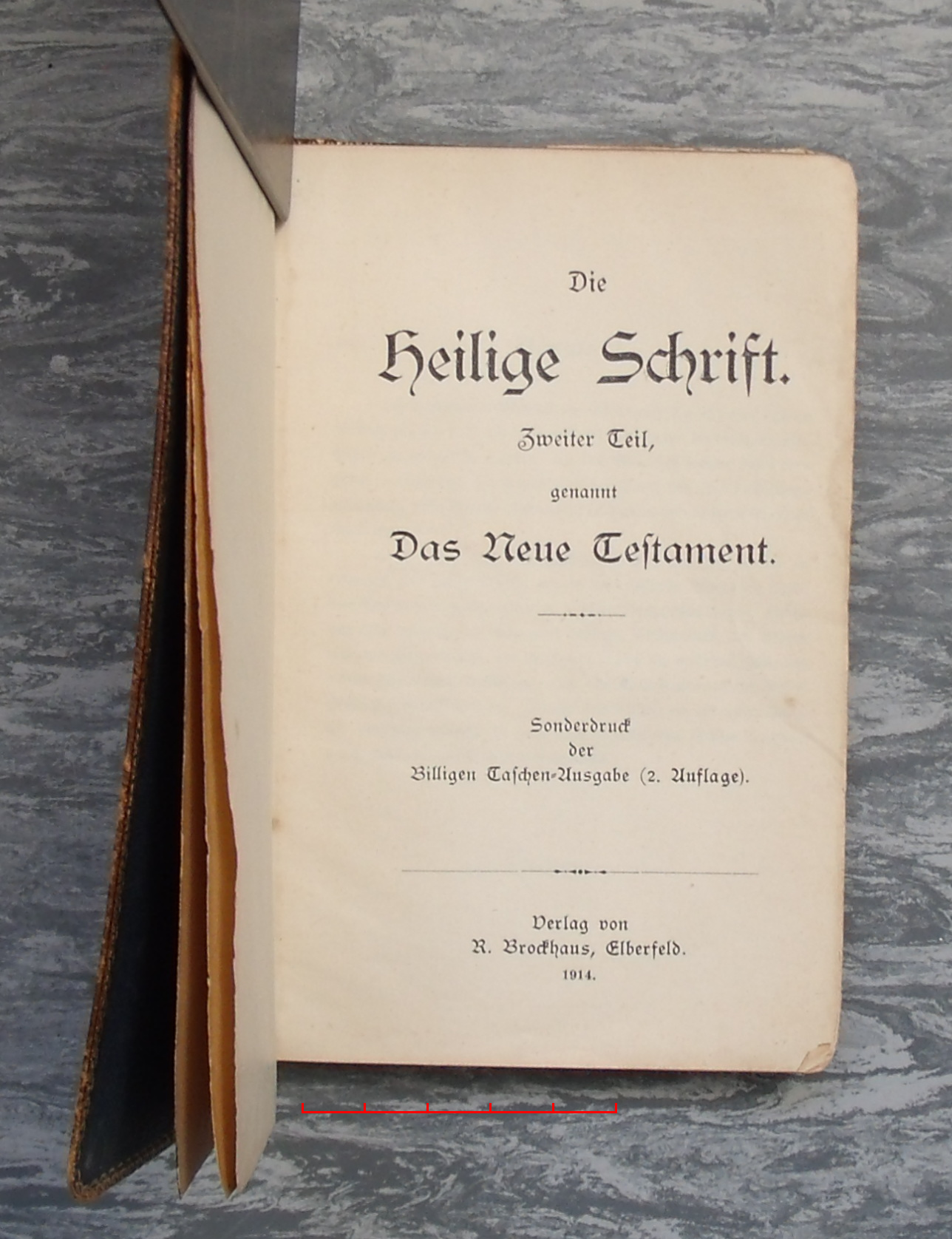 Goldschnitt, Fraktursatz. Druck: Albert Fastenrath, Elberfeld, Aue 1-5. Enthält vorn „Vorwort“, „Verzeichnis der Bücher des Neuen Testamentes“, „Erklärung der Abkürzungen in den Anmerkungen“.