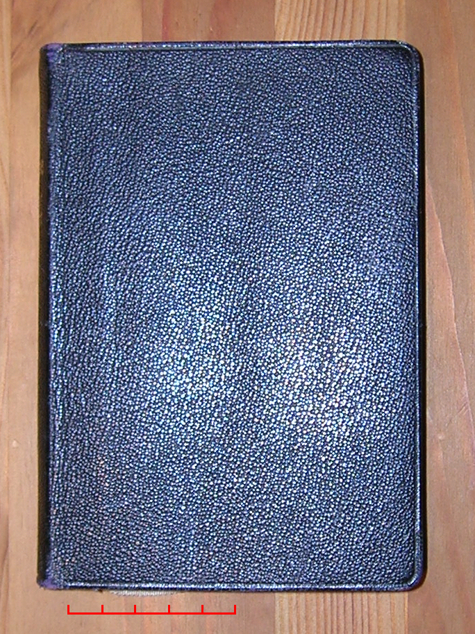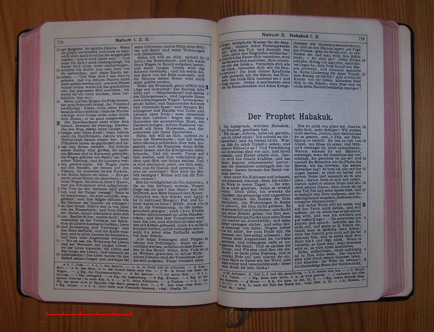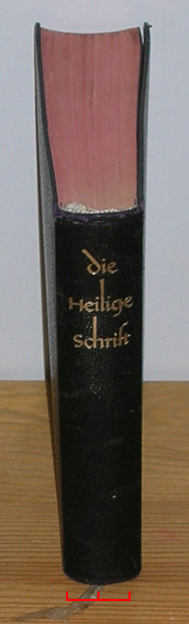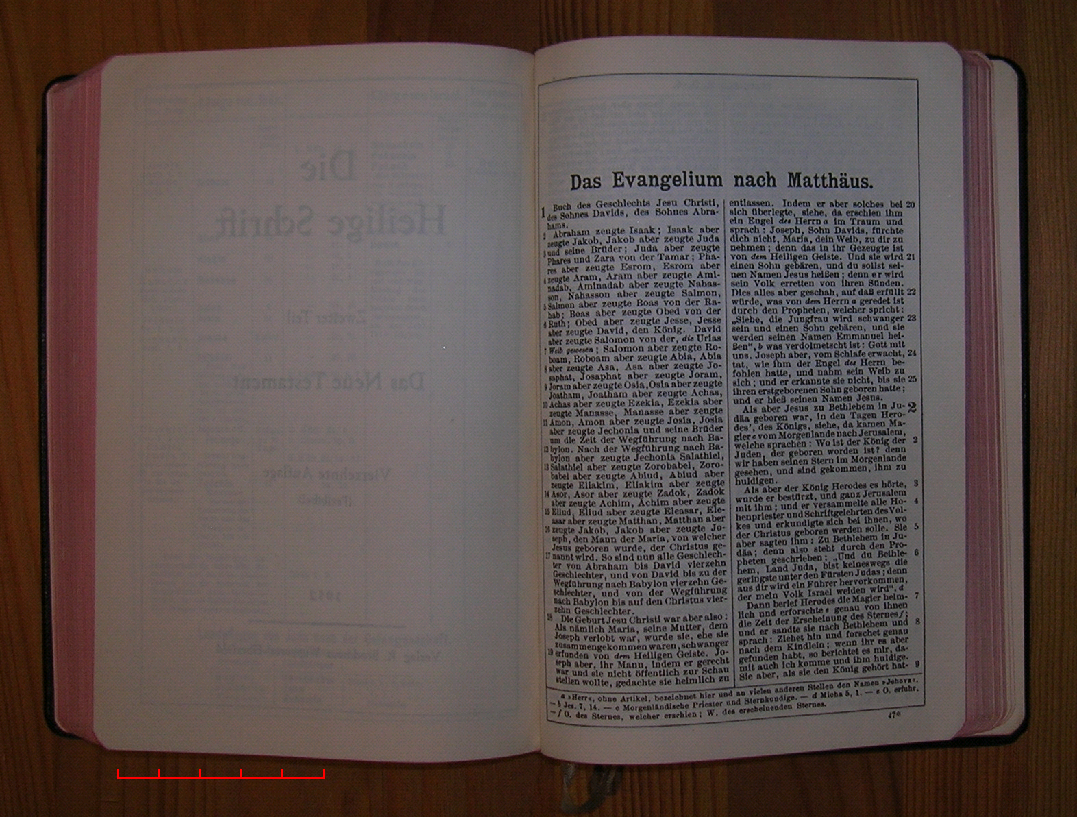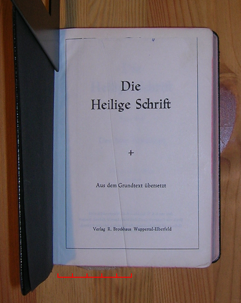 Violetter Schnitt, Lesebändchen. Satz von F. & W. Brockhaus K.-G., Wuppertal-Elberfeld. Druck von Omnitypie-Gesellschaft Nachf. Leopold Zechnall, Stuttgart. Gedruckt auf Dünndruckpapier der Papierfabrik Schoeller & Hoesch. Gernsbach (Baden). Enthält vor AT „Vorwort“, „Verzeichnis der Bücher des Alten Testamentes“, „Verzeichnis der Bücher des Neuen Testamentes“ und „Erklärung der Abkürzungen in den Anmerkungen“; dahinter „Vergleichende Zeittafel der Könige und Propheten von Juda und Israel“.