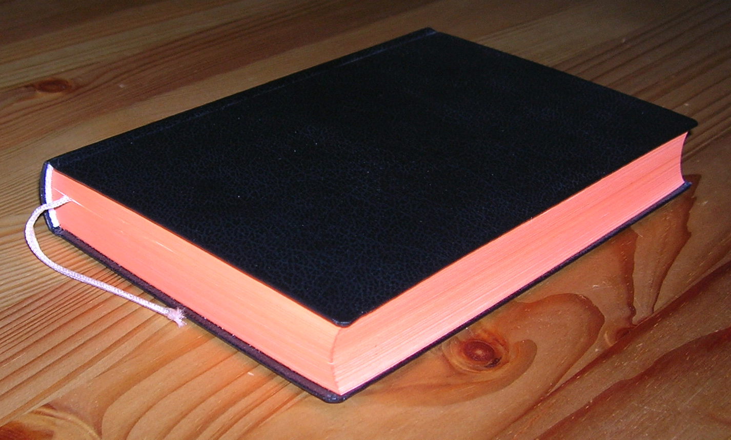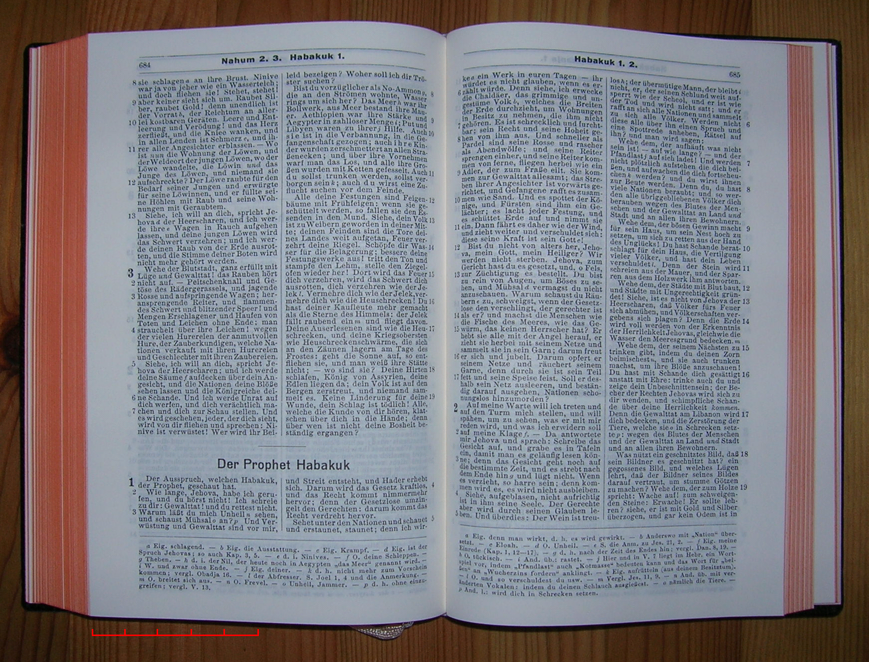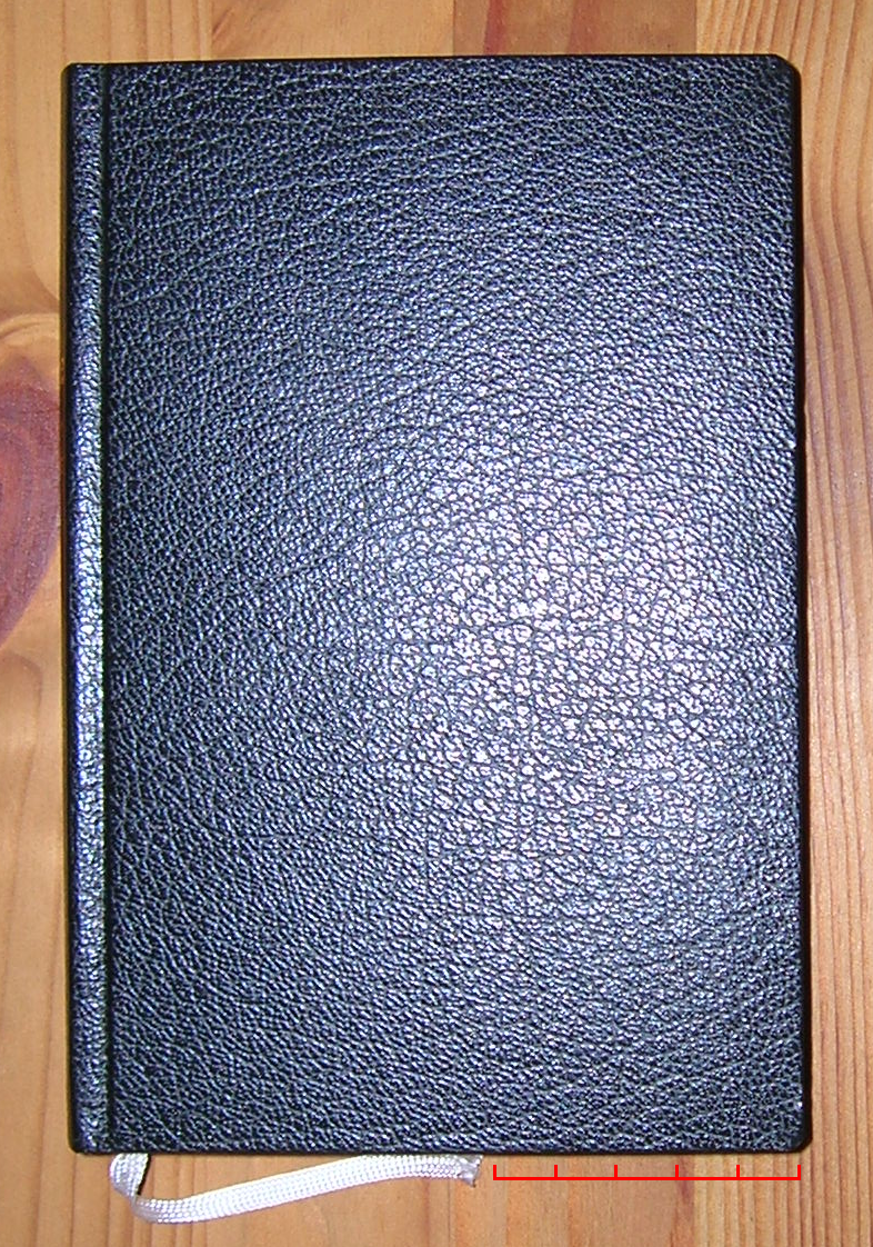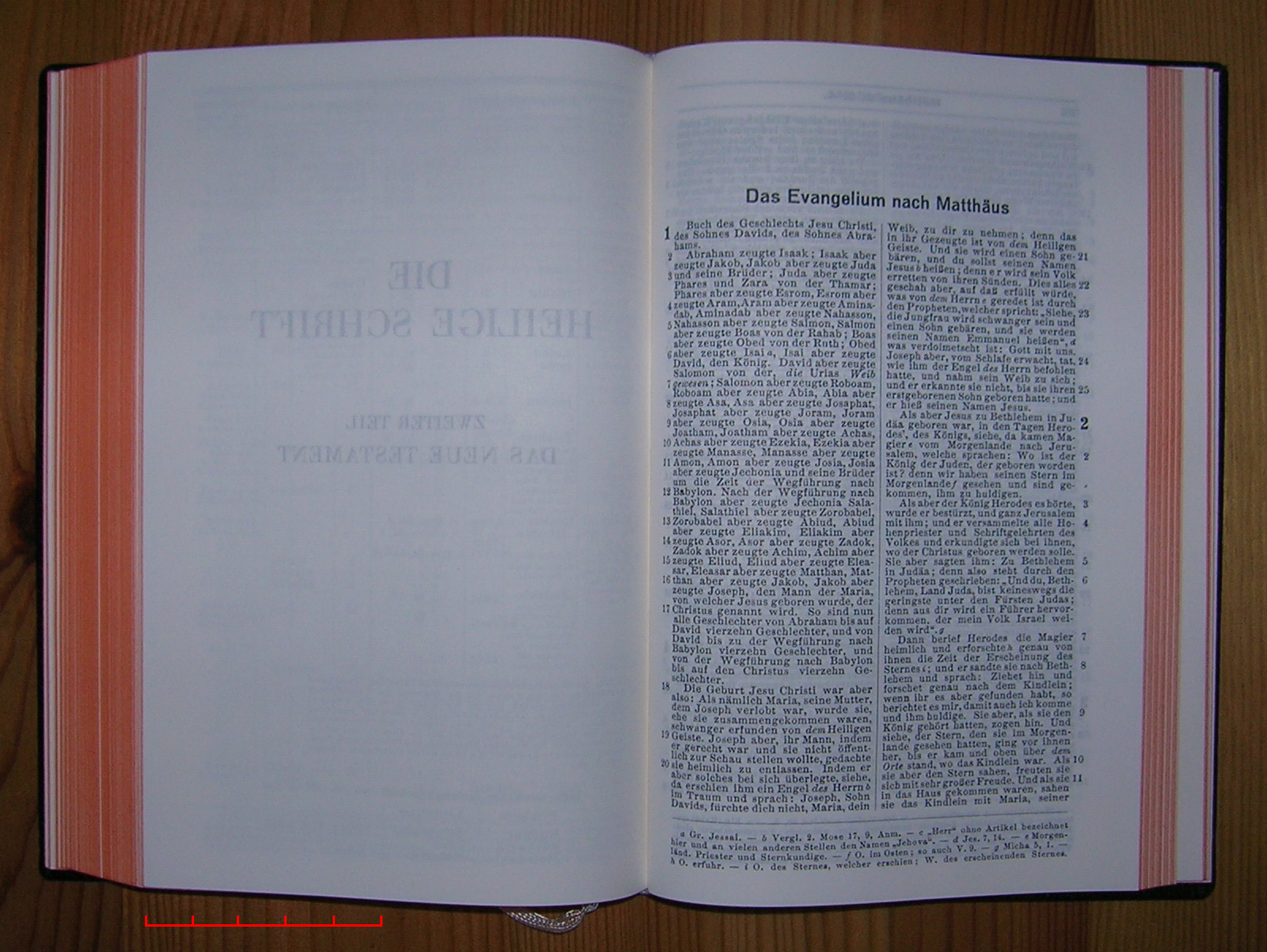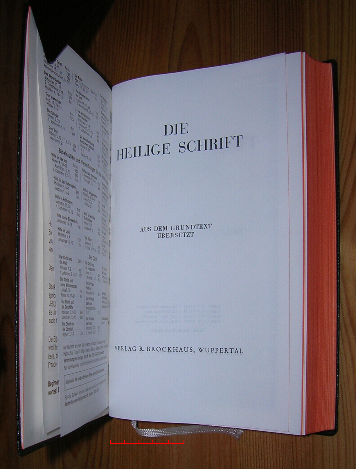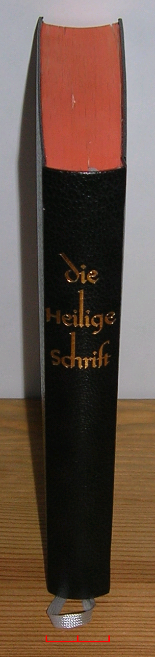 Orangener Schnitt, Lesebändchen. Druck: Biblia-Druck GmbH. Enthält vor AT „Das Wort Gottes“, „Die Bibel und ihre Einteilung“, „Die Person Jesu Christi, aus Seinem Leben und aus Seinen Reden“, „Einige biblische Aussagen über:“, „Bibelstellen und Verheißungen für das tägliche Leben“, „Der Christ“ (alle diese als 2 Seiten eingeklebt), „Vorwort“, „Vorwort zur 1. Auflage der Perlbibel 1905“, „Verzeichnis der Bücher des Alten Testamentes“, „Verzeichnis der Bücher des Neuen Testamentes“ und „Erklärung der Abkürzungen in den Anmerkungen“; dahinter „Vergleichende Zeittafel der Könige und Propheten von Juda und Israel“.